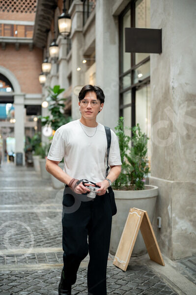 Thai man in white shirt, eyeglasses, and earbuds holding camera and looking away walking in hallway of shopping mall