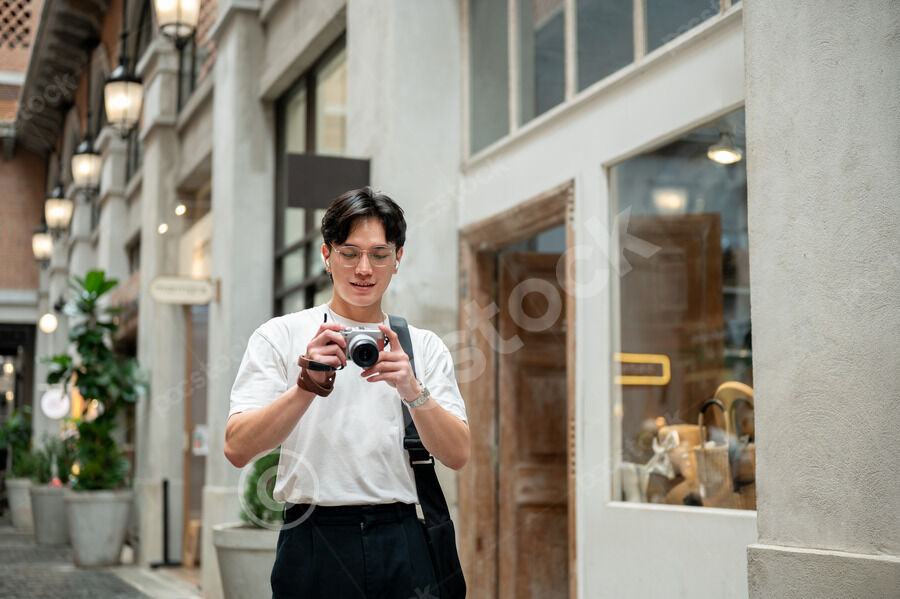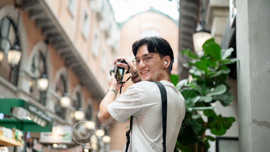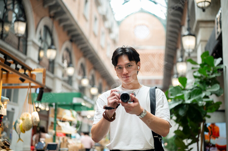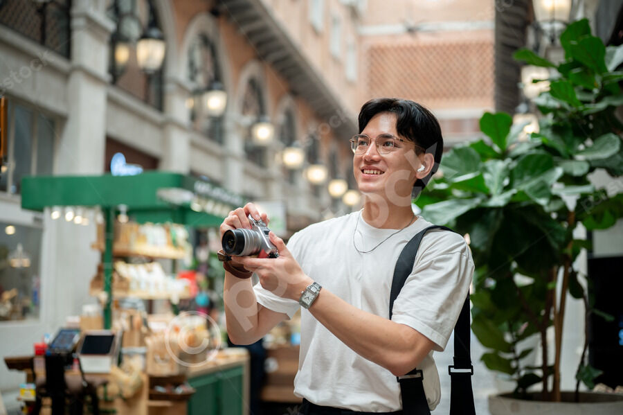 Thai man in white shirt, eyeglasses, and earbuds taking photos using camera while walking in hallway of shopping mall