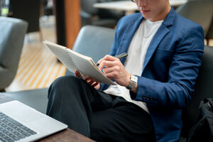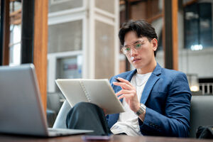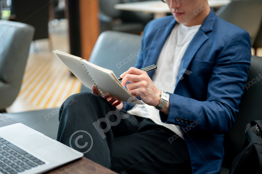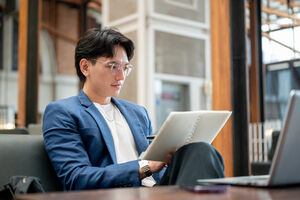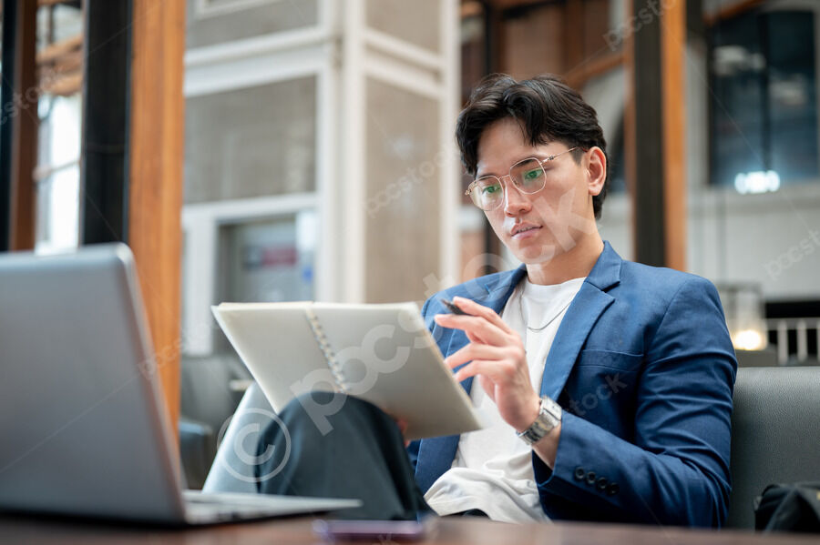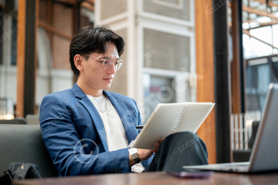 Thai businessman in blue suit and eyeglasses reading notebook while sitting at table with laptop and smartphone in cafe