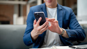 Cropped image of Thai businessman in blue suit using smartphone while sitting at table in cafe