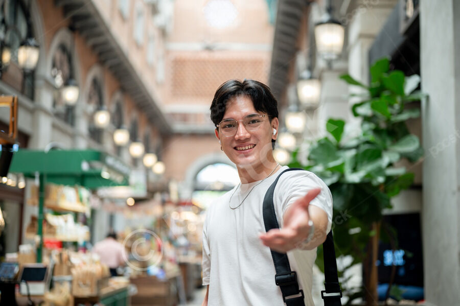 Thai man in white shirt, eyeglasses, and earbuds extending his hand forward while standing in hallway of shopping mall