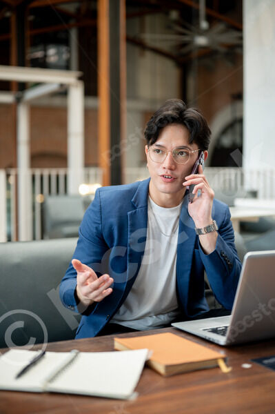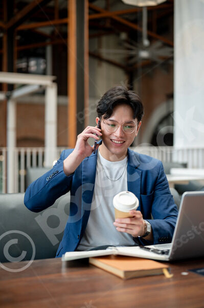 Thai businessman in blue suit and eyeglasses having phone call and holding takeaway coffee cup looking away while sitting at table with laptop and notebooks in cafe