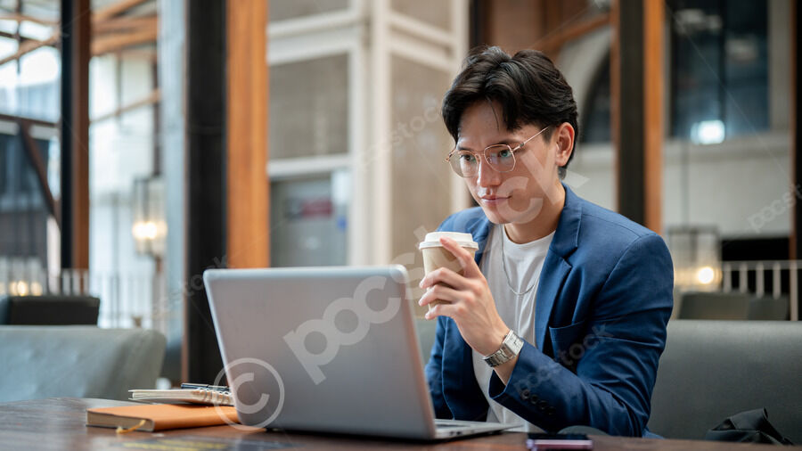 Thai businessman in blue suit and eyeglasses holding takeaway coffee cup and looking at laptop screen while sitting at table with notebooks and smartphone in cafe