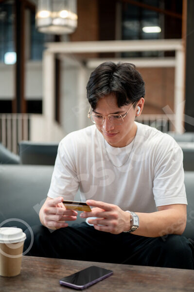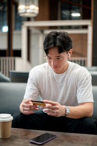 Thai man in white shirt, eyeglasses, and earbuds holding and looking at credit card while sitting at table with coffee and smartphone in cafe