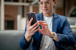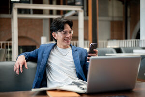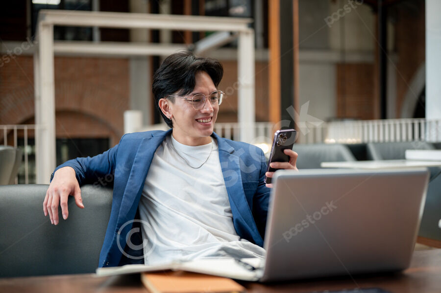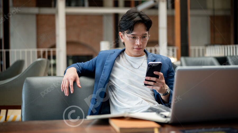 Thai businessman in blue suit and eyeglasses using smartphone while sitting on sofa in cafe