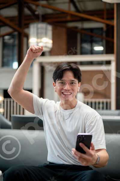 Thai man in white shirt, eyeglasses, and earbuds holding smartphone and raising his fist while sitting on sofa in cafe