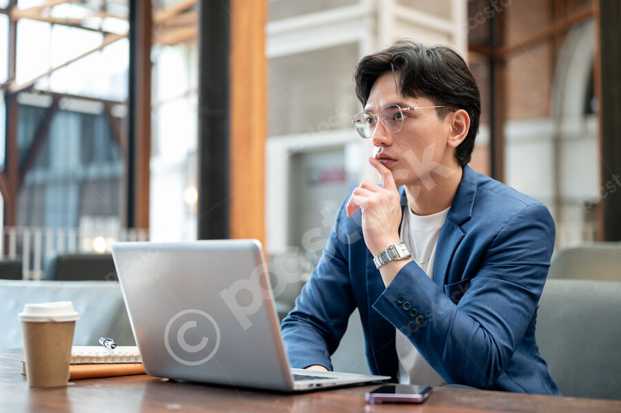 Thai businessman in blue suit and eyeglasses touching his chin and looking away thinking while sitting at table with notebooks, smartphone, and laptop in cafe
