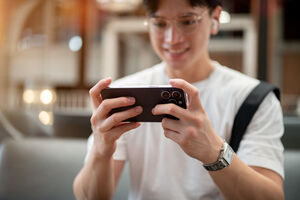 Thai man in white shirt and eyeglasses holding his smartphone horizontally while sitting on sofa in cafe