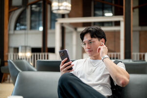 Thai man in white shirt, eyeglasses, and wireless earphones using smartphone sitting on sofa in cafe