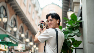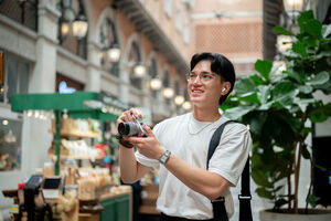 Thai man in white shirt, eyeglasses, and earbuds looking around holding camera while standing in shopping mall