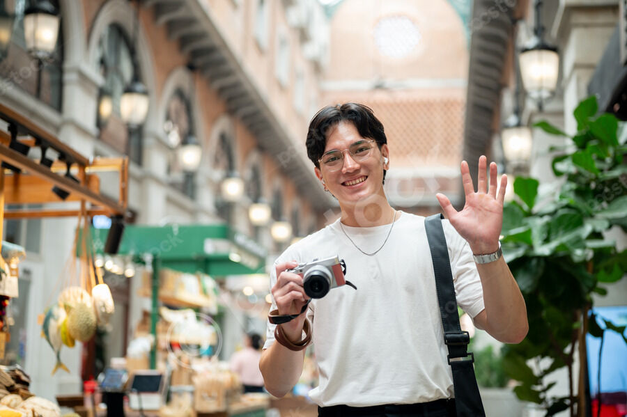 Thai man in white shirt, eyeglasses, and earbuds holding camera and waving his hand while standing in hallway of shopping mall