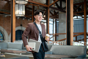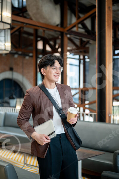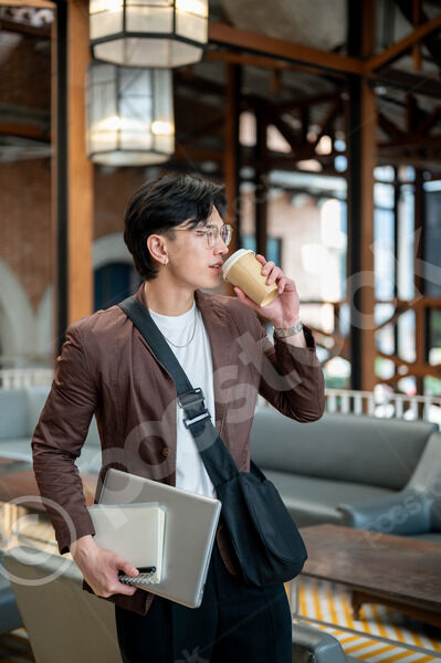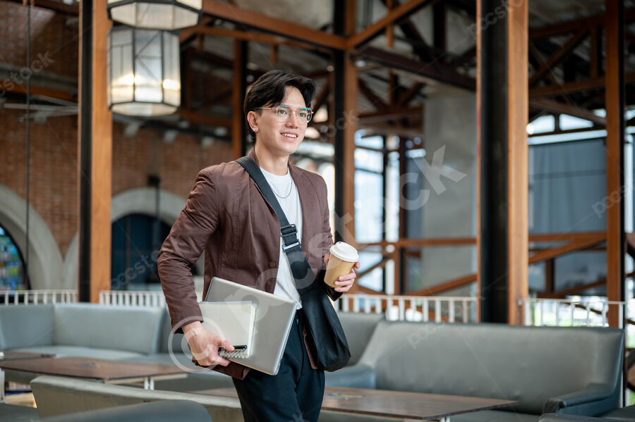 Thai businessman in brown suit and eyeglasses holding notebook, laptop, and takeaway coffee cup while walking in cafe