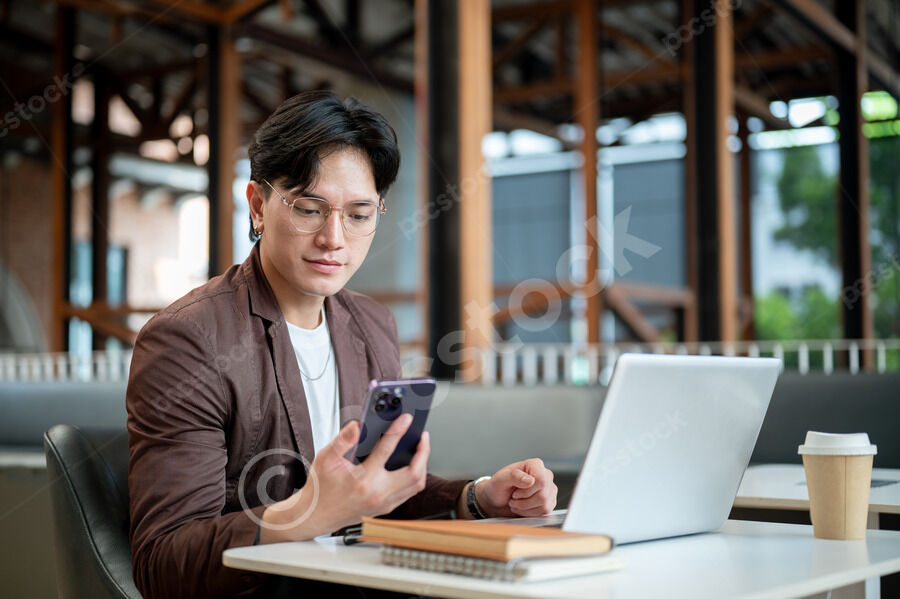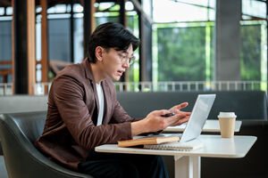Thai businessman in brown suit and eyeglasses using laptop and smartphone while sitting at table with takeaway coffee cup and notebooks in cafe
