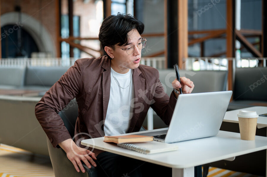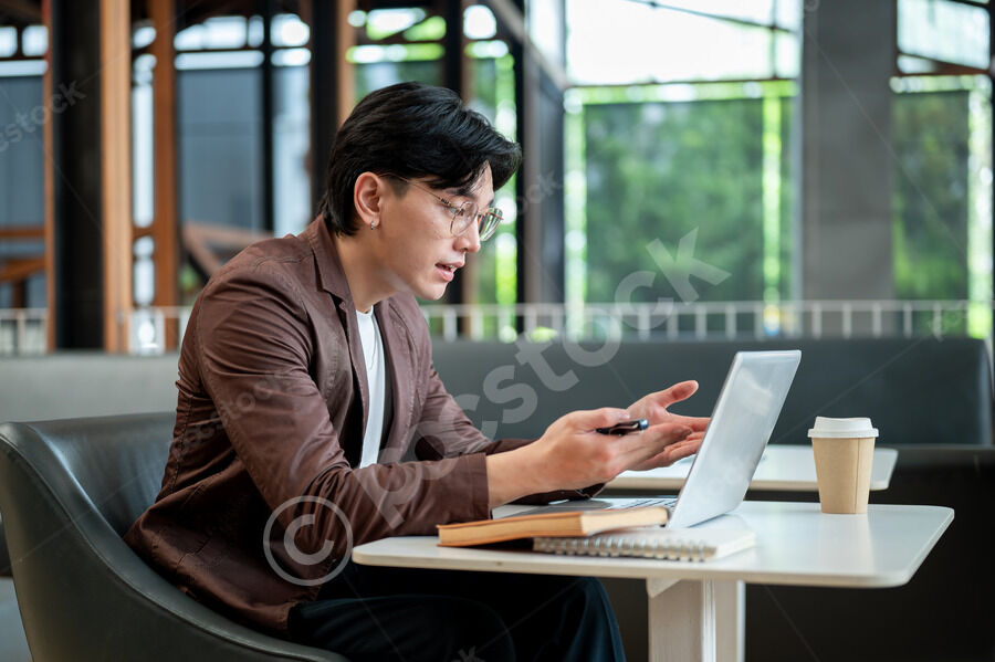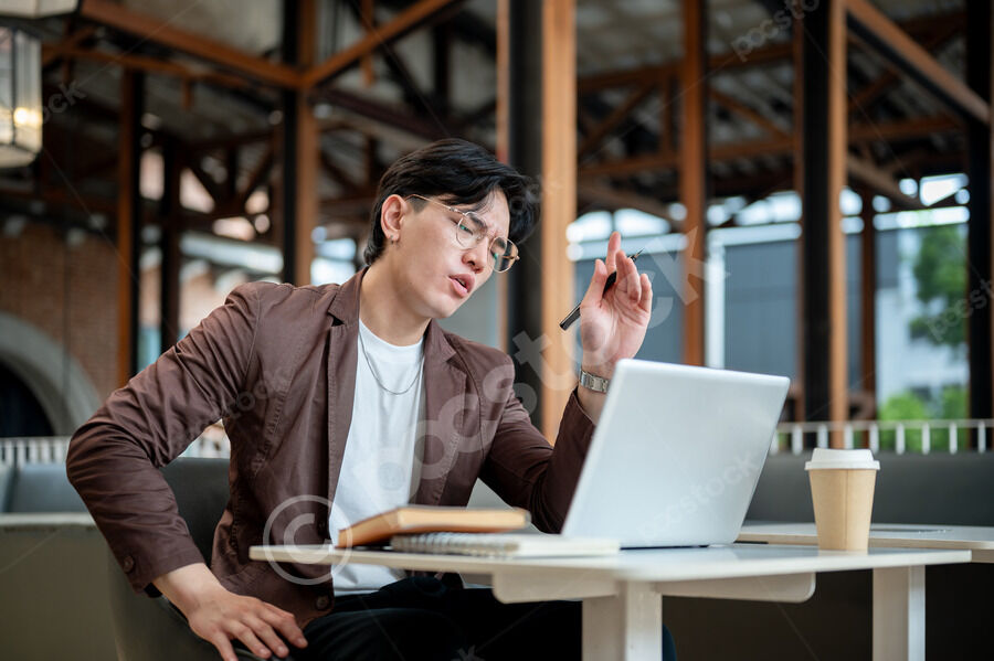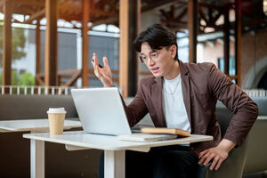 Angry Thai businessman in brown suit attending online meeting on laptop while sitting at table with takeaway coffee cup and notebooks in cafe