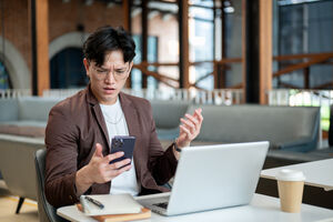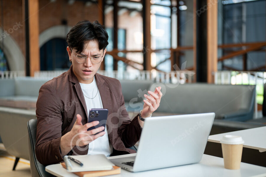Stunned Thai businessman in brown suit and eyeglasses looking at his smartphone and gesturing while sitting at table with laptop, notebooks, and takeaway coffee cup in cafe