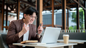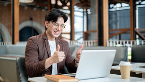 Thai businessman in brown suit and eyeglasses attending online meeting on laptop and giving thumbs up while sitting at table with takeaway coffee cup and notebooks in cafe