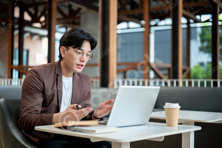 Thai businessman in brown suit attending online meeting on laptop and having an argument while sitting at table with takeaway coffee cup and notebooks in cafe