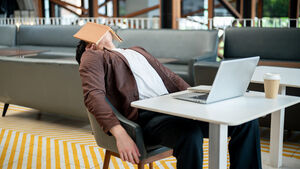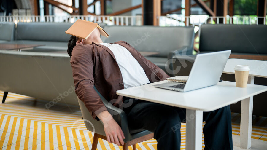Tired Thai businessman in brown suit leaning back on chair with his face covered with book while sitting at table with laptop and takeaway coffee cup in cafe