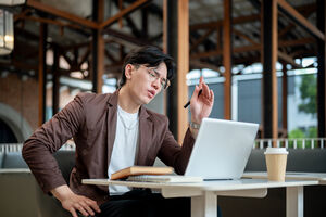 Thai woman with hand on chin holding pen sitting at table with laptop in outdoor cafe on sunny day