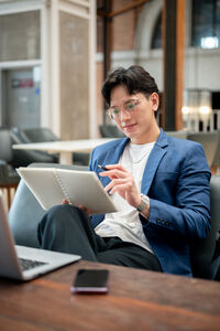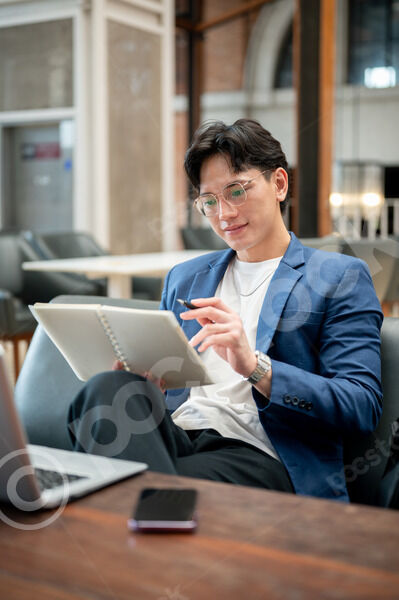 Thai businessman in blue suit and eyeglasses holding notebook and pen looking away thinking while sitting at table with laptop and smartphone in cafe