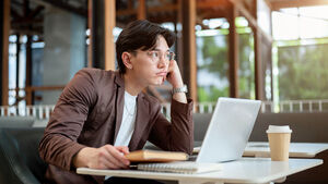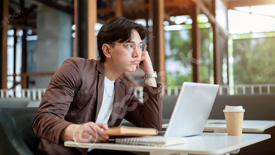 Bored Thai businessman in brown suit holding book and leaning face on his hand looking away while sitting at table with laptop and takeaway coffee cup in cafe