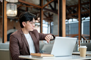 Thai businessman in brown suit and eyeglasses looking at his wristwatch while sitting at table with laptop, takeaway coffee cup, and notebooks in cafe