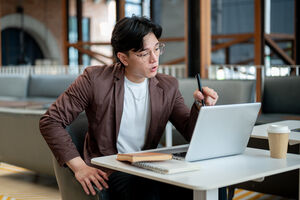 Thai businessman in blue suit and eyeglasses reading notes and holding pen while sitting at table with laptop and smartphone in cafe