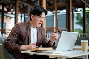 Thai businessman in brown suit attending online meeting on laptop while sitting at table with takeaway coffee cup and notebooks in cafe