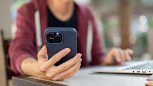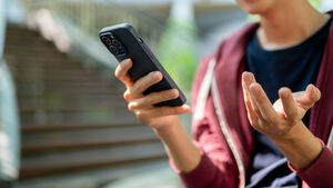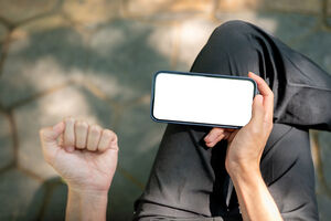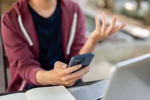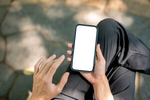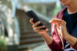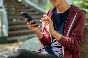 Cropped image of Thai man using smartphone while sitting outdoors during daytime