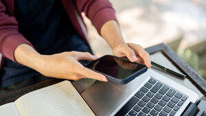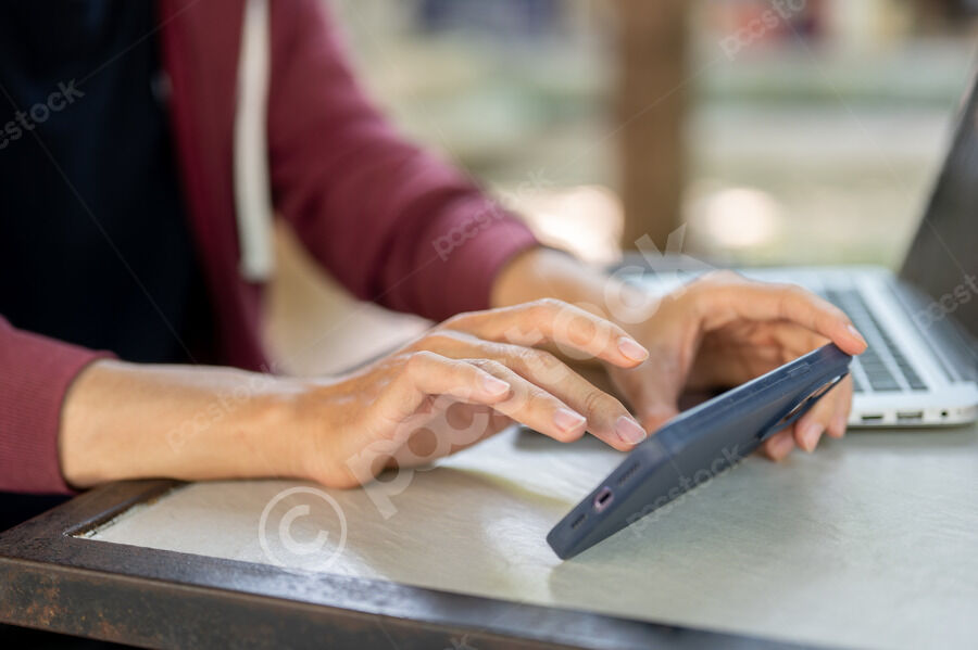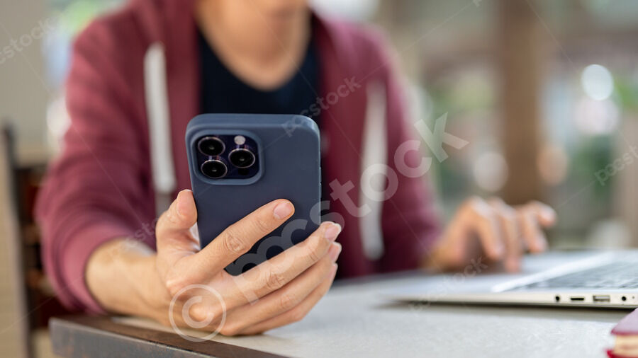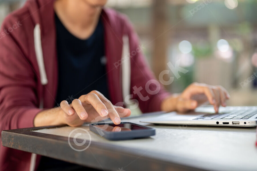 Cropped image of Thai man using smartphone and laptop while sitting at table outdoors during daytime