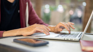 Cropped image of Thai man typing on laptop while sitting at table with smartphone outdoors during daytime