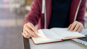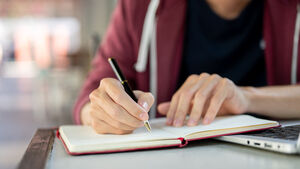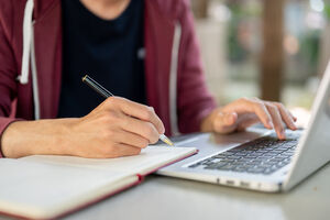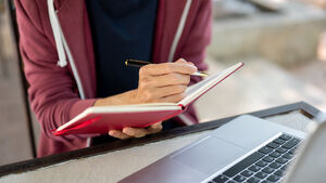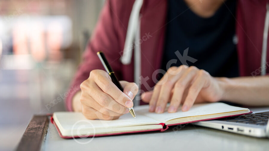 Cropped image of Thai man writing in notebook while sitting at table with laptop outdoors during daytime