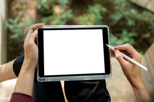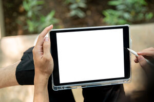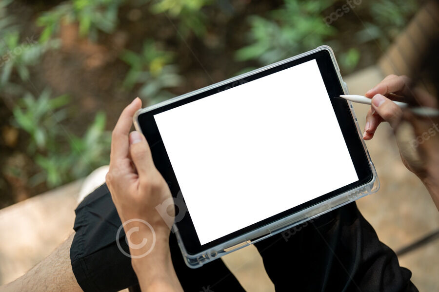 Cropped image of Thai man using digital pen and tablet while sitting outdoors during daytime