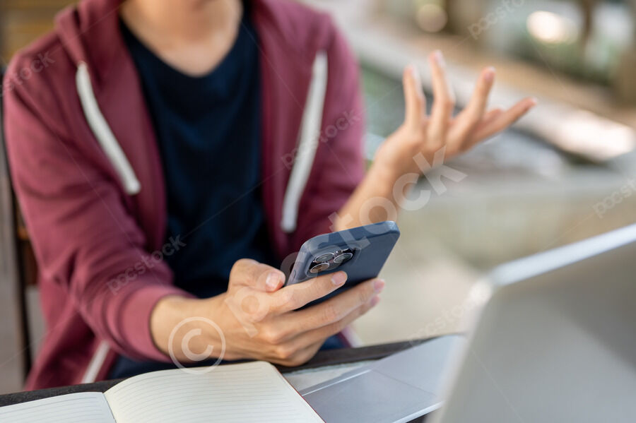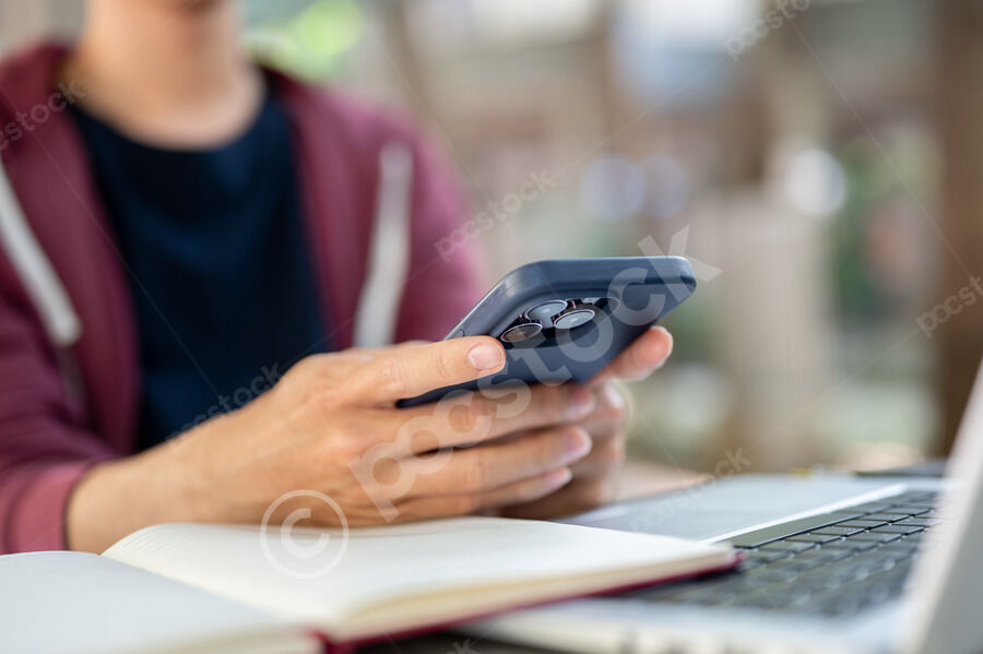 Cropped image of Thai man using smartphone while sitting at table with laptop and notebook outdoors during daytime