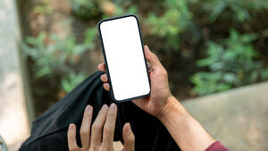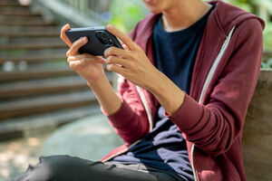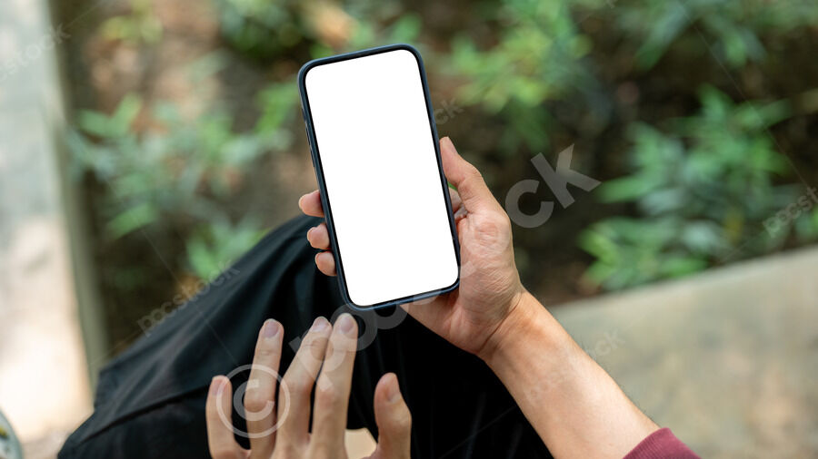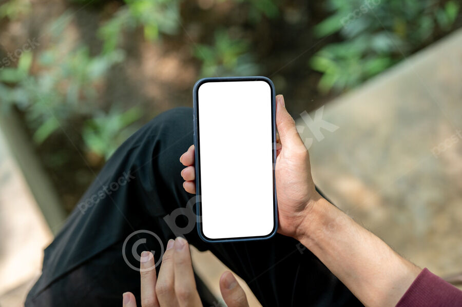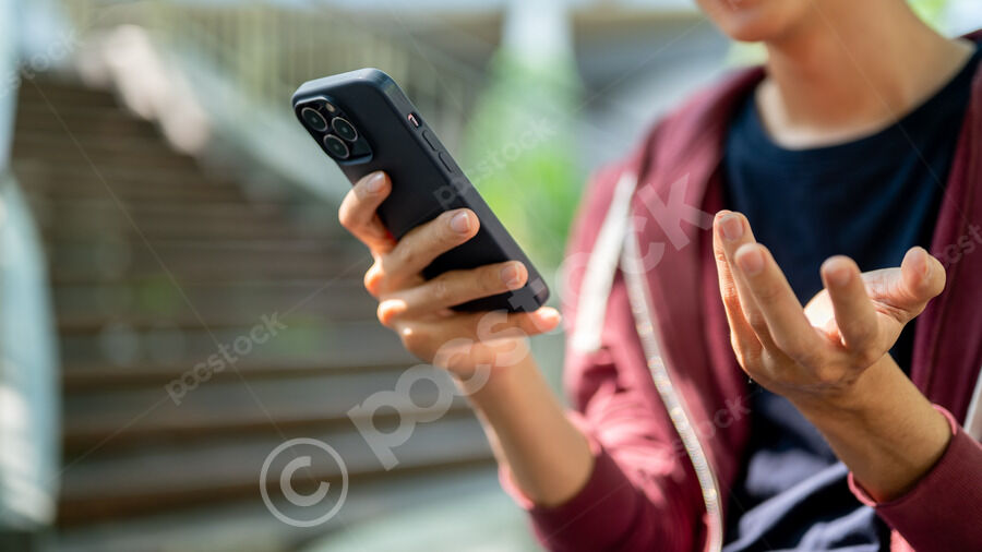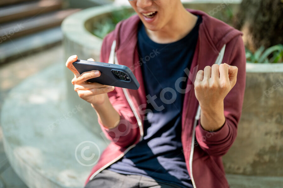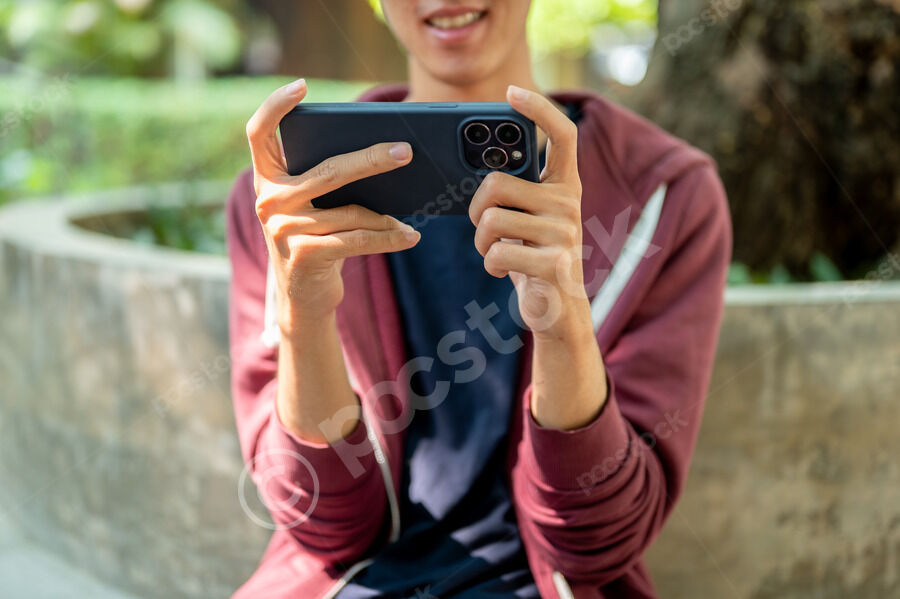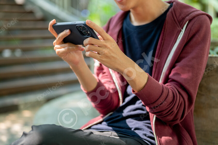 Cropped image of Thai man playing online game on smartphone while sitting outdoors during daytime