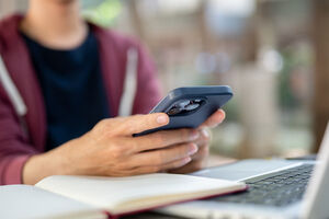 Cropped image of Thai man using smartphone while sitting at table with laptop outdoors during daytime