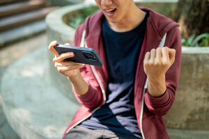 Cropped image of Thai man playing online game on smartphone and showing fist while sitting with crossed legs outdoors during daytime