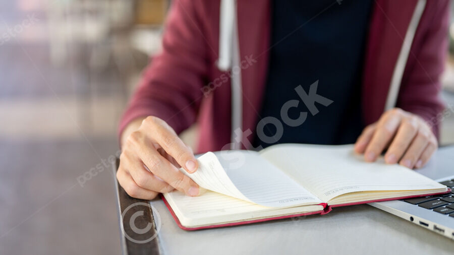 Cropped image of Thai man reading book while sitting at table outdoors during daytime
