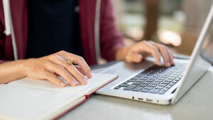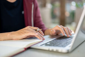 Cropped image of Thai man writing in notebook and typing on laptop while sitting at table outdoors during daytime