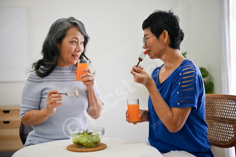 Smiling senior Asian woman and middle-aged Asian female friend holding glass of orange juice and salad bowl while sitting in dining room at home