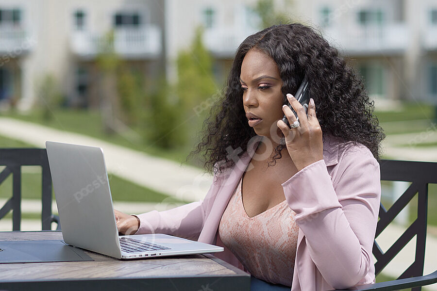 Black woman sitting outside in park sunny day typing working laptop computer talking on phone