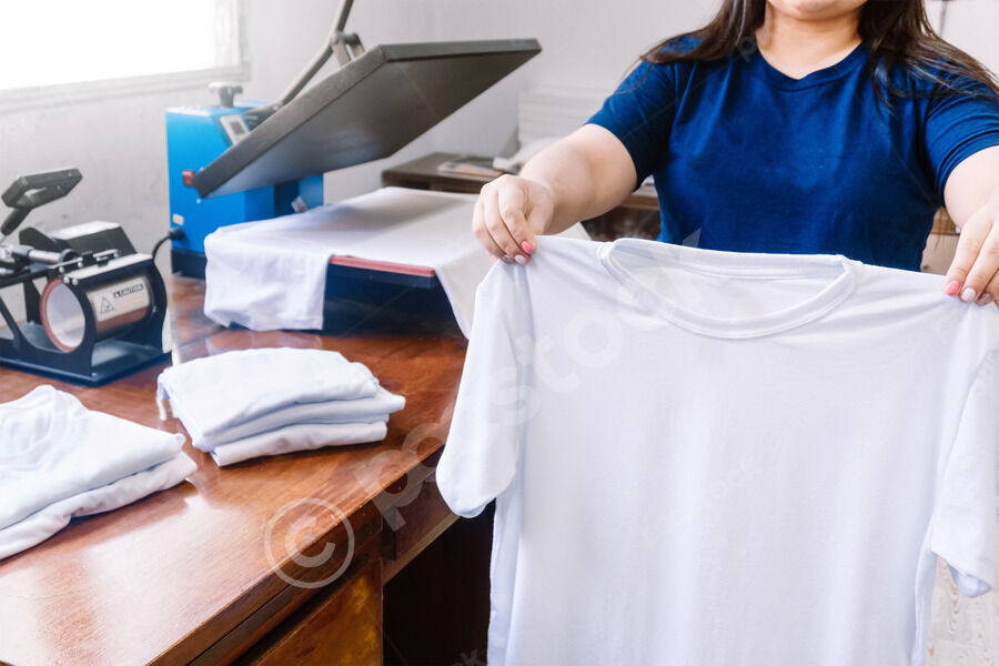 Cropped image of Hispanic male worker printing on t-shirt using machine in warehouse