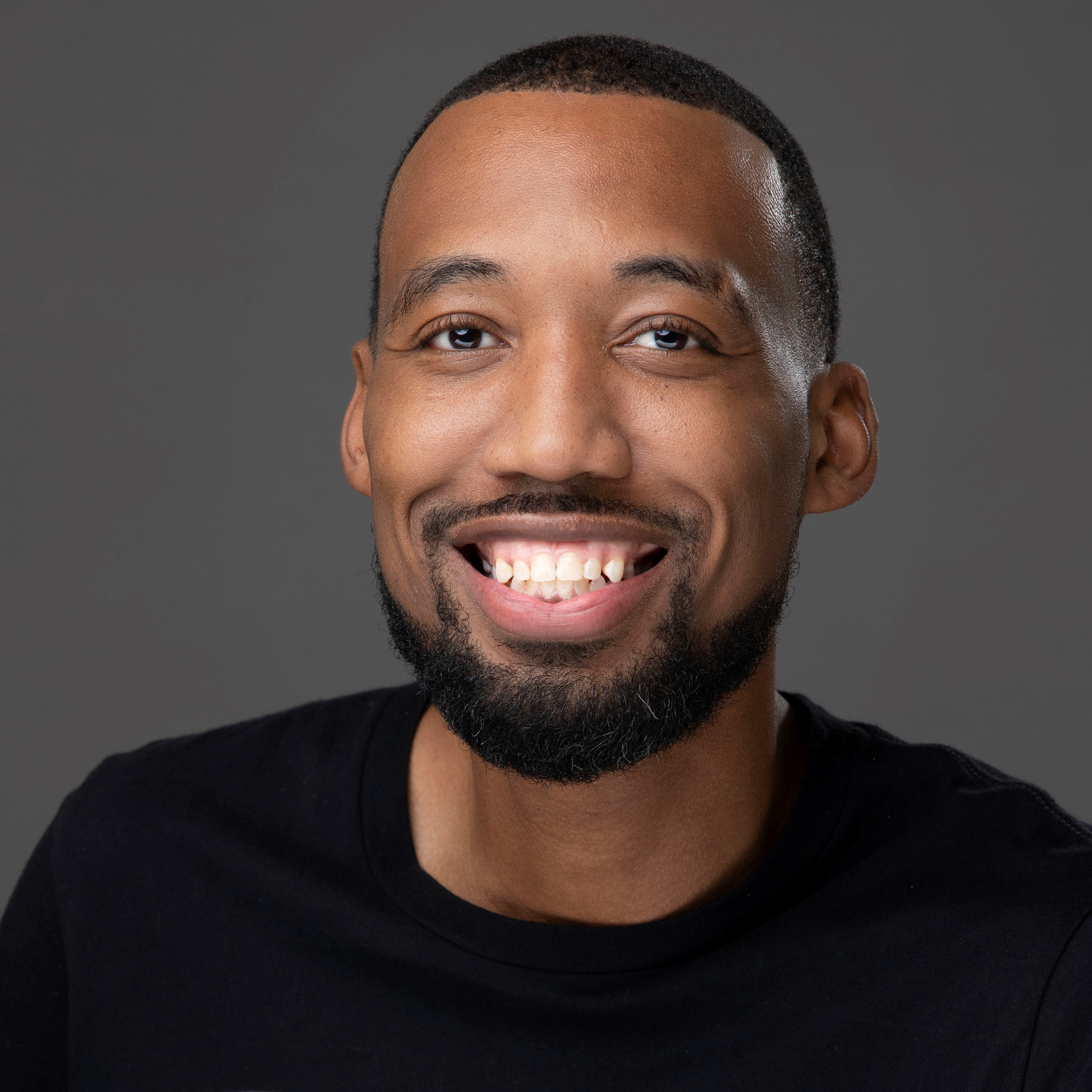 Black man with camera and hands in pockets leaning against brown wall indoors