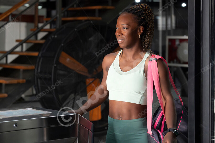 Black woman in fitness wear carrying her sports bag and looking away while walking out of the gym after her training session