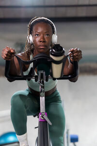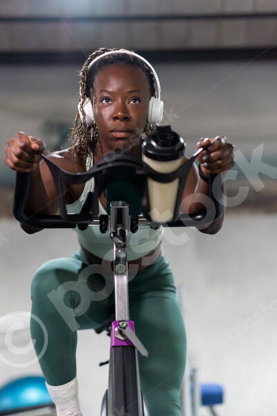Black woman in fitness wear and headphones looking away using exercise bike during training session in gym