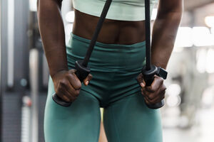 Cropped image of Black woman in fitness wear exercising arm muscles using rope machine with grip while standing in gym