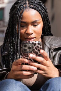 Black woman wearing leather jacket using smartphone while sitting outdoors during sunny day