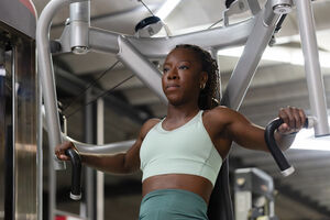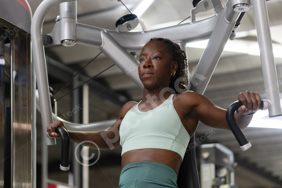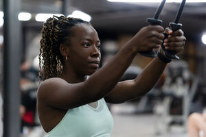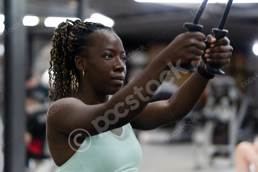 Black woman performing standard triceps rope pulldowns exercise at the gym