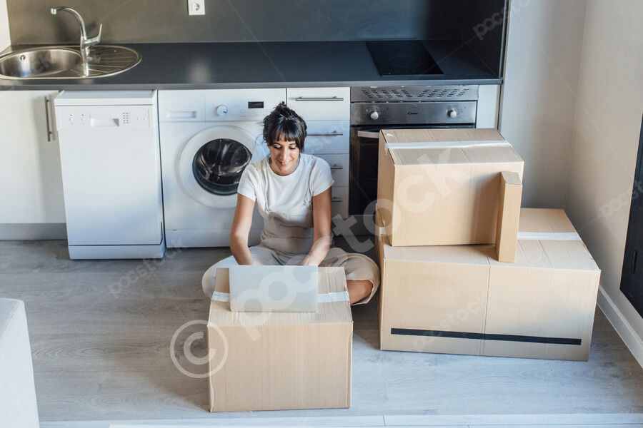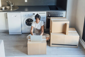 Smiling Hispanic woman using laptop on cardboard box in front of washing machine in utility room at home