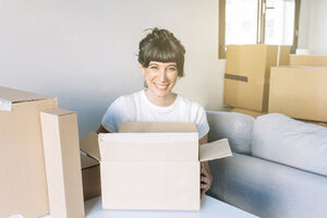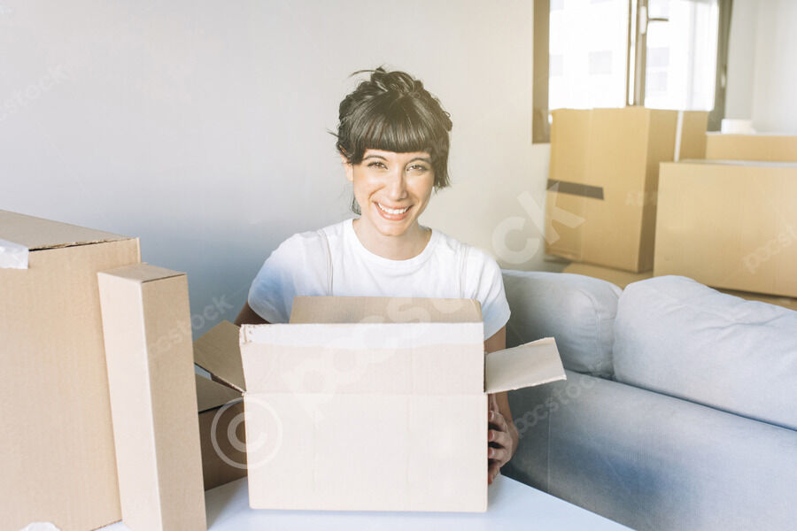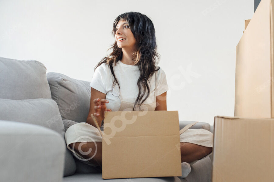 Smiling Hispanic woman looking away tying hair sitting with cardboard box on sofa in living room at home